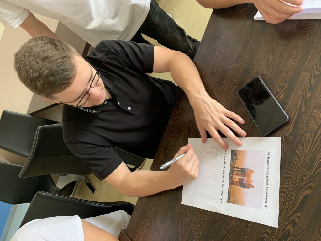 Jetzt heißt es: Erfahrungen sammeln so viel es geht! – zwei Wochen nach Arbeitsbeginn bot sich dazu die Gelegenheit einer Schnitzeljagd durch die gesamte Koßmannschule. Die Azubis und Praktikanten, eingeteilt in drei 4er-Teams, mussten insgesamt 31 Rätsel rund um Krämer IT lösen, um anschließend mit einem Lösungswort den Schatz zu finden – der Spaß kam hier nicht zu kurz und mittlerweile sind die Berufsstarter richtige Experten in Sachen Krämer IT.