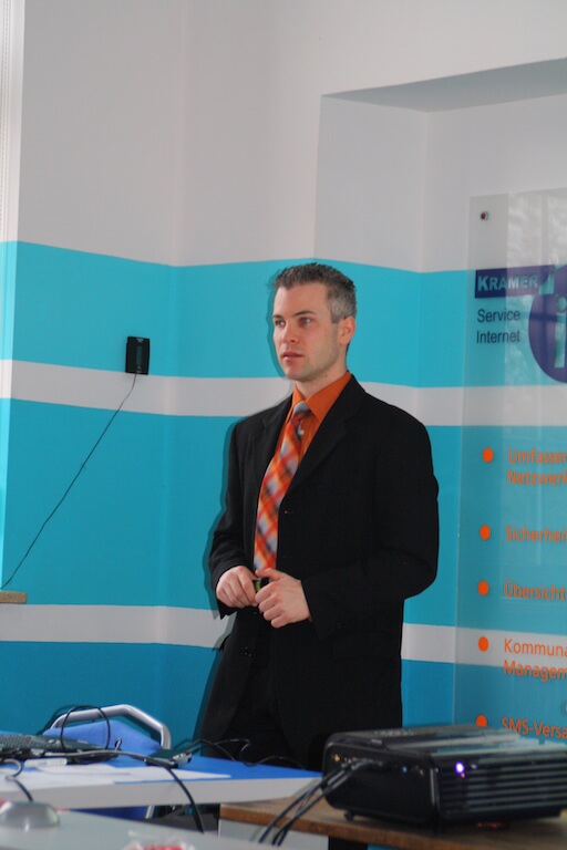 Im dritten Teil hat unser Kollege Dominik Carl mit seiner üblichen charmanten und liebenswerten Art die theoretischen Informationen der ersten beiden Vorträge in einem Live-Test vorgeführt. Mobile Datenkommunikation per USB Stick, Anbindung an ein Firmennetzwerk per VPN und UMTS. Arbeiten im Terminalserver sowie die Überwachung der BlackBerry Server auf Funktionalität und Probleme mit den eigens für diese Veranstaltung entwickelten Agents zu unserem Produkt Server Eye 3 rundeten den Tag ab. Wie in einem Live-Test üblich gab es auch im Gegensatz zur grauen Theorie einige Hürden und Stolpersteine, die die Veranstaltung interessant und praxisorientiert machten.