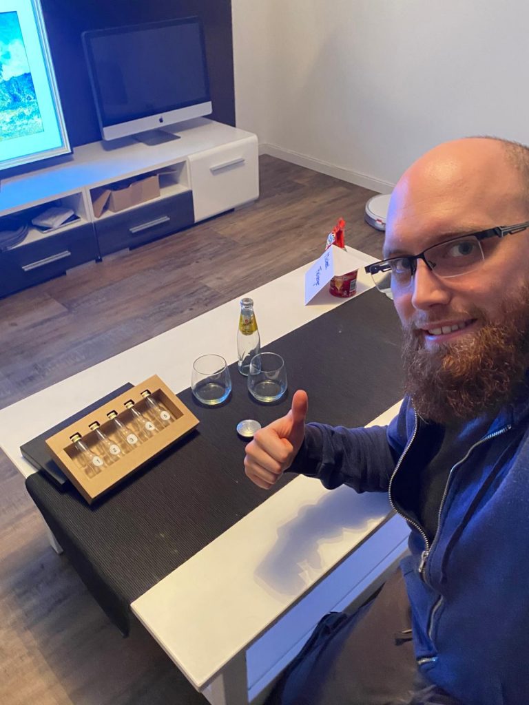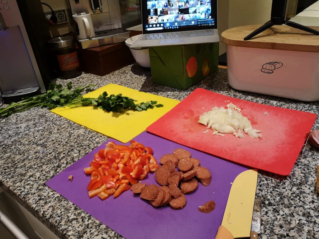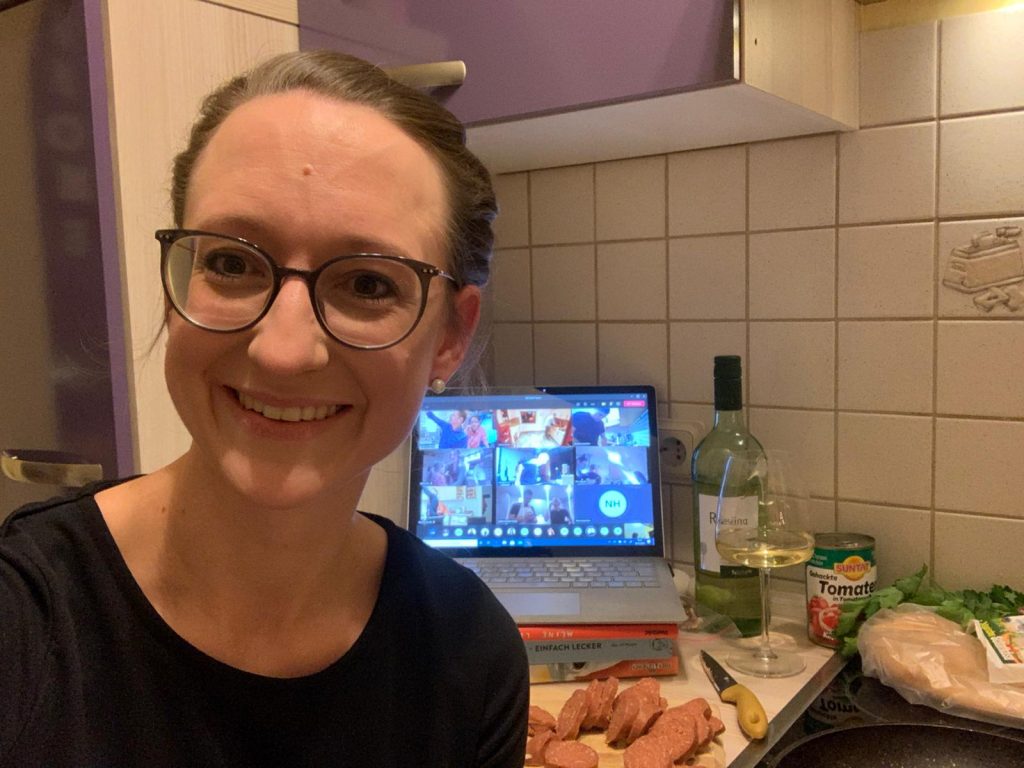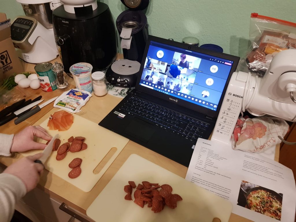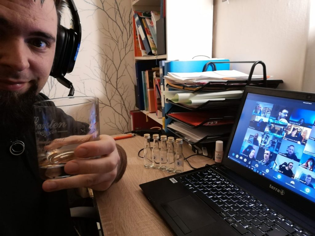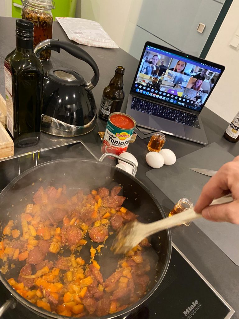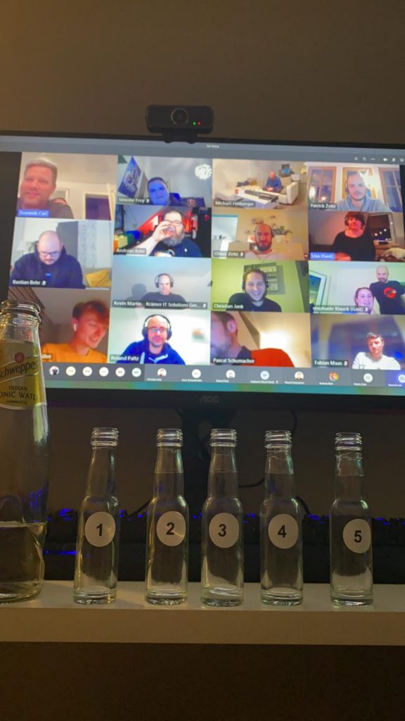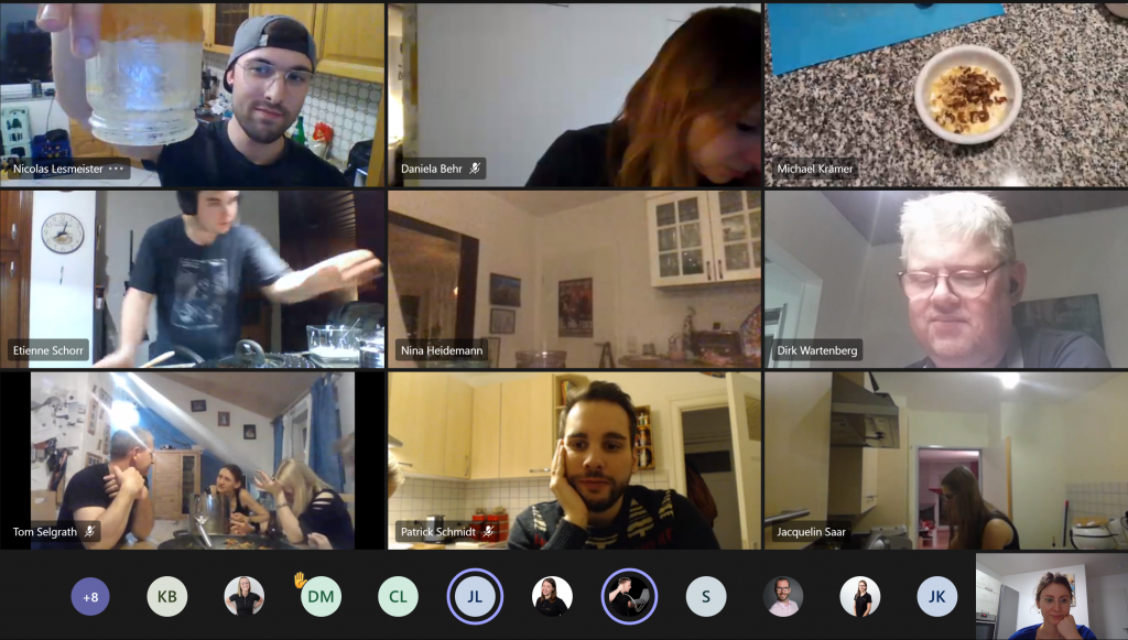 Nach einer leckeren Portion Schakschuka – angeleitet von Christina Krämer – und genussvollen Verkostungen von Whiskey oder Gin stand ein top organisiertes Abendprogramm auf dem Plan. Der persönliche Austausch sollte an diesem Abend nicht zu kurz kommen und so konnte ein Vor-Ort-Event mittels einer Videokonferenzlösung den Umständen entsprechend bestmöglich nachgestellt werden. Alle Mitarbeiter bewegten sich innerhalb von drei verschiedenen Meetingräumen, aufgeteilt in Barbereich, Chillout-Lounge und Quiz-Raum und konnten so einen abwechslungsreichen Abend genießen.