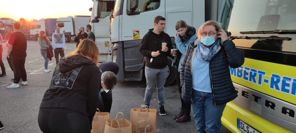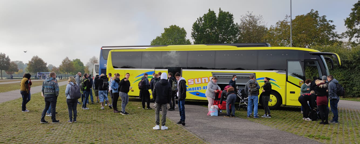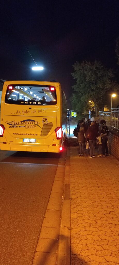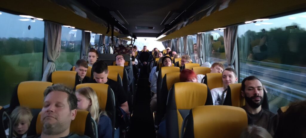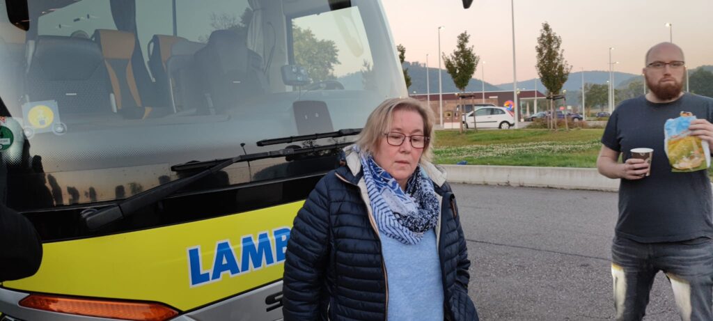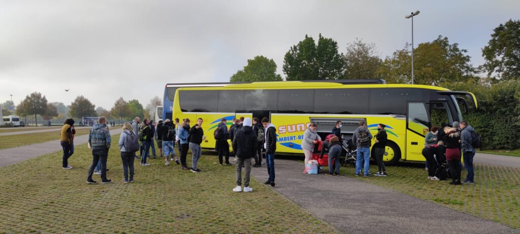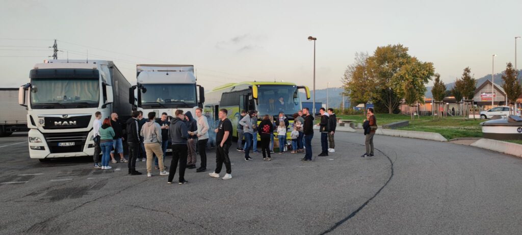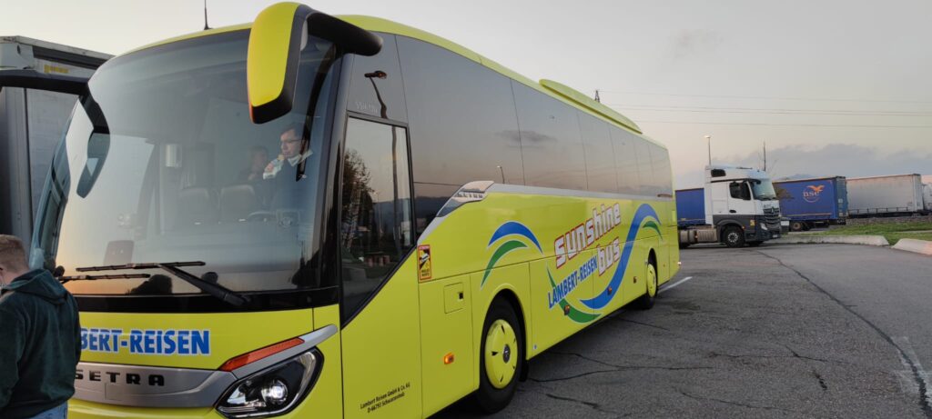 So war es dann auch – am 09.10. machten sich 50 unserer MitarbeiterInnen inklusive Familienangehörigen auf den Weg nach Rust. Um 06:15 Uhr startete die Fahrt mit dem gelben Sunshine Bus von Lambert Reisen in Richtung Europapark. Für Verpflegung unterwegs war reichlich gesorgt. Gegen 07:30 Uhr stoppte die Fahrt in Frankreich, um sich bei einer kurzen Rast mit belegten Brötchen, Schokohörnchen und Getränken zu stärken.