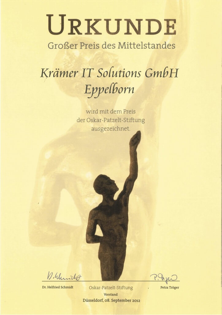 Am 08. September 2012 wurden in Düsseldorf die erfolgreichsten Unternehmen Deutschlands beim begehrten „Großen Preis des Mittelstandes 2012″ ausgezeichnet. Dabei setzte sich Krämer IT Solutions GmbH unter den 3589 nominierten Unternehmen aus 16 Bundesländern durch und erhielt einen der begehrten Oskars. Für das 44-köpfige Unternehmen ist dies schon die zweite Auszeichnung innerhalb eines Monats. Bereits im August erzielte das Unternehmen den 2. Platz bei der Wahl zu Deutschlands besten Systemhäusern.