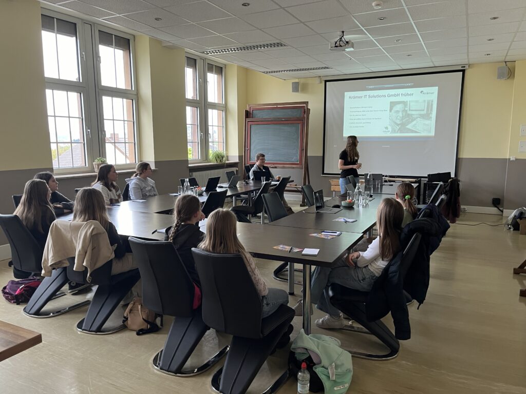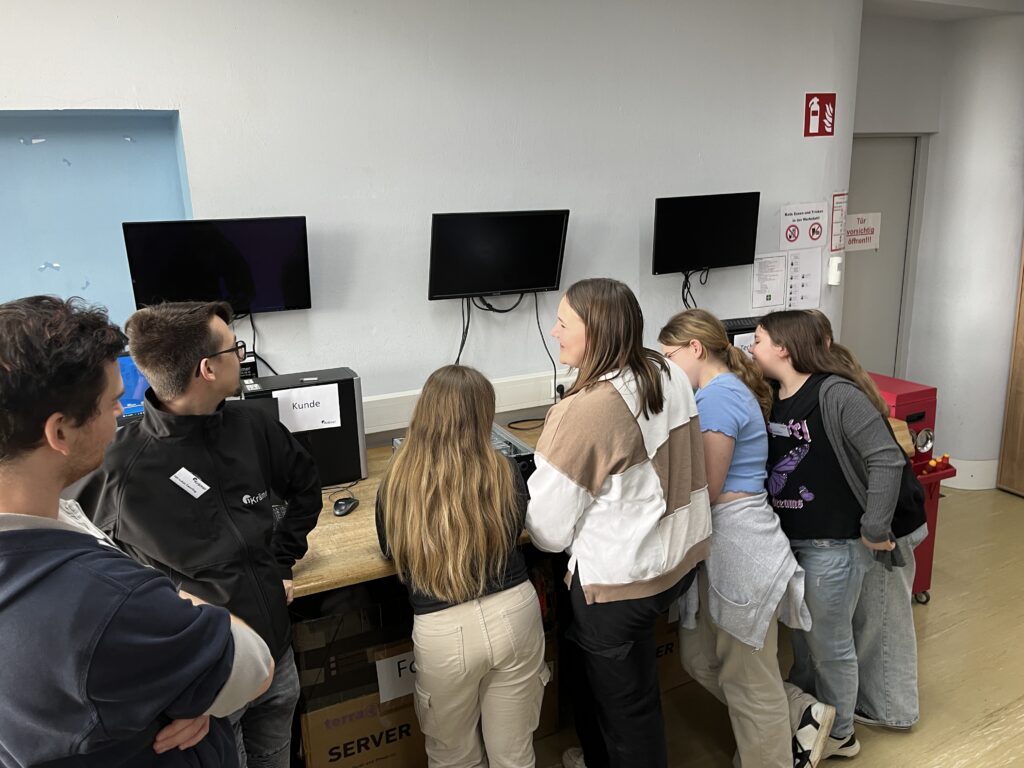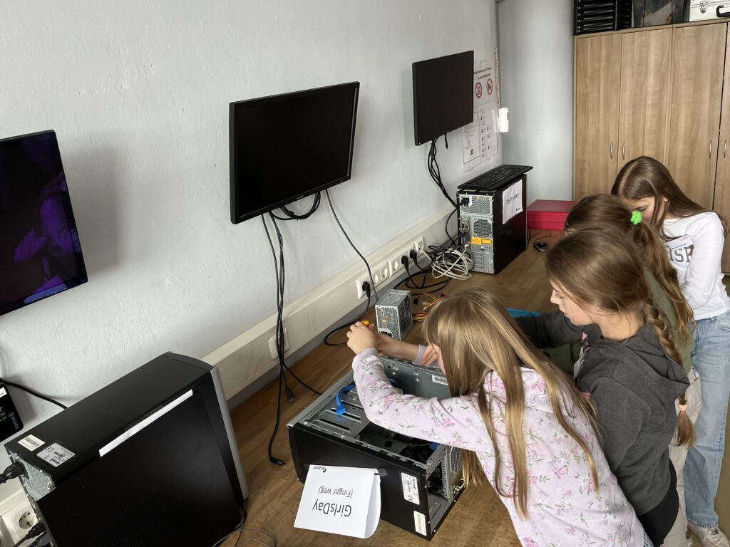 Der Tag begann mit einer herzlichen Begrüßungsrunde durch unseren Geschäftsführer Michael Krämer. Nach einer kurzen Einführung wurden die Mädchen in zwei Gruppen eingeteilt, um sich nacheinander an kleinen Mitmachaktionen zu versuchen. Eine Gruppe tauchte in die Welt der Anwendungsentwicklung ein, wo sie unter der Anleitung von Marvin eine eigene App programmierten. Die andere Gruppe widmete sich der Systemintegration und baute unter der fachkundigen Leitung von Steffen einen PC zusammen.