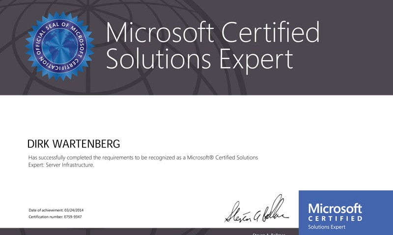 Im Nachfolgenden geben wir Ihnen einen Überblick über einige neue Zertifikate, welche unsere Mitarbeiter in jüngster Zeit erhalten haben. So haben Bastian Behr, Jan Lorenz, Sascha Gerhard, Oliver Zeitz,Patrick Zeitz, Andreas Peter, Kai Hortt, Dominik Carl und Philipp Jochem den Praxiskurs Server 2012 gemacht. Patrick Paulus und Jens Mohr haben ihren MCSA-Schein (Microsoft Certificate of Achievement) erhalten. Dieser beinhaltet das Training “Configuring Windows Server 2012 Service”.