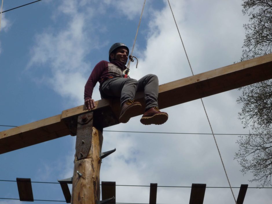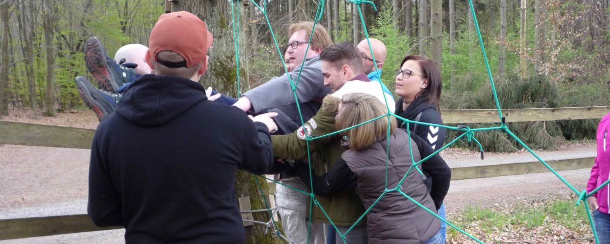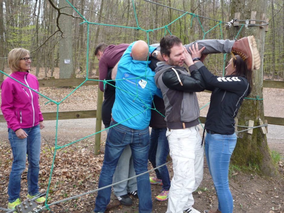 Jeder mutige Mitarbeiter durfte sich in luftige Höhe begeben und sich dort seinen Weg über wacklige Bretter und Balken, angeordnet in T-Form, suchen. Gesichert wurde er durch die anderen Mitarbeiter am Boden. Der Grundgedanke war auch hier das volle Vertrauen in die Gruppe und das gemeinsame Überwinden der Hindernisse. Sichtlich angespannt, aber auch im Nachhinein stolz meisterten wir diesen Abschnitt des Fun Forests.