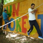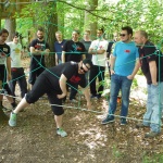 Jeder Mitarbeiter hatte 1-2 Schnüre in der Hand. In der Mitte des Parcours lag ein Ball auf einem Rohr, den wir mit den Schnüren in einen 20 Meter entfernten Eimer befördern mussten, um die Bombe zu “entschärfen”. Fällt der Ball auf den Boden, so ist die Mission gescheitert. Zum Glück hat es unser Team geschafft, sodass niemand verletzt wurde.