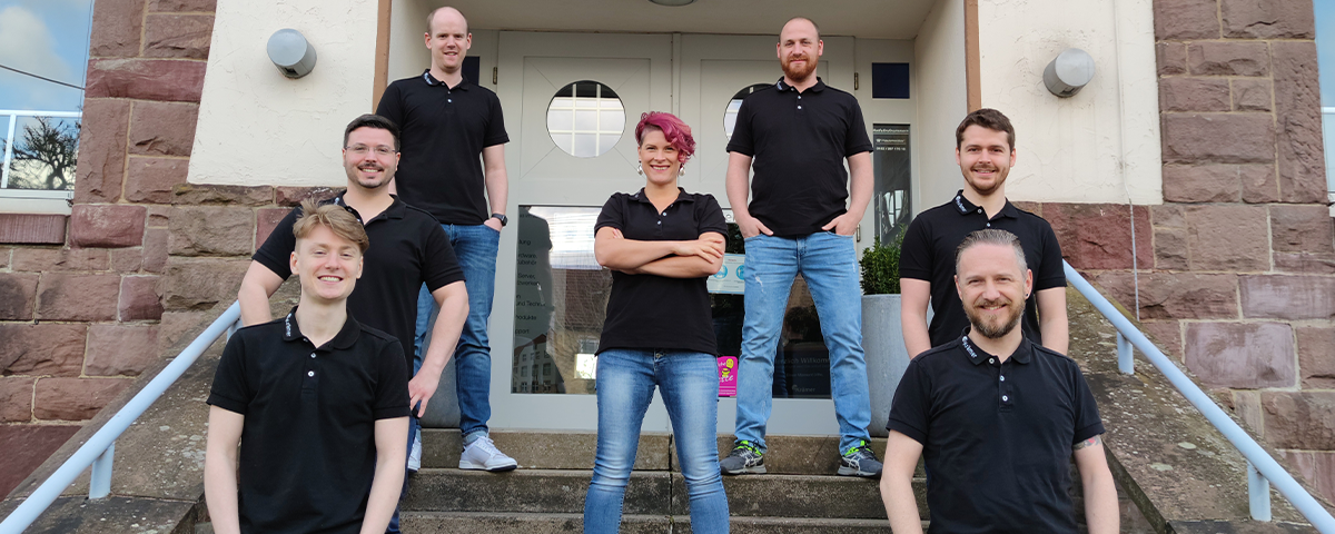 Eine Frau und sieben Männer rocken täglich den Krämer IT Vertrieb. Laut Team-Chef Kevin Martin hat Nina Heidemann, als einzige Frau im Team, die Männer allerdings voll im Griff.