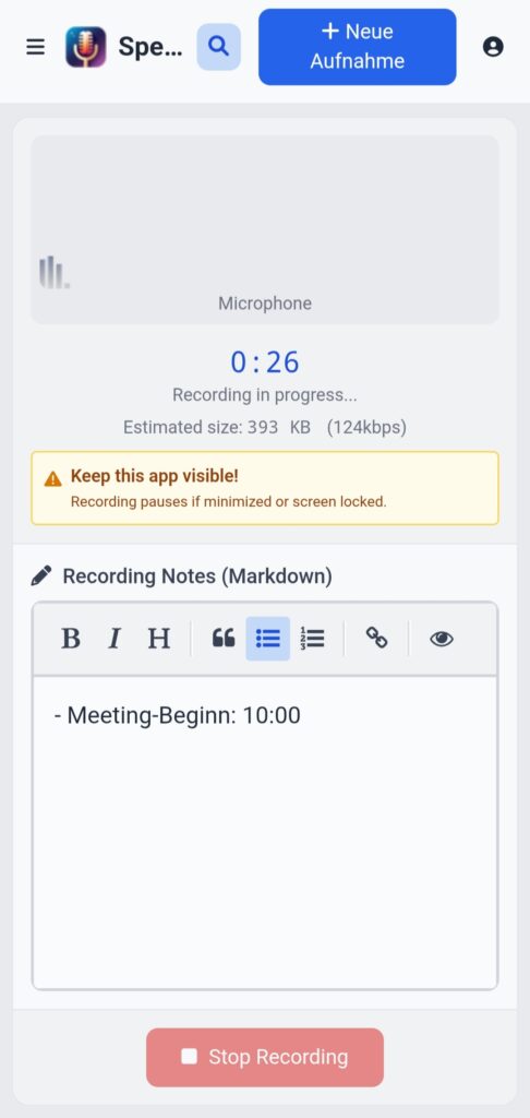 • Mehrere Aufnahmemodi (Mikrofon, Systemaudio oder beides)