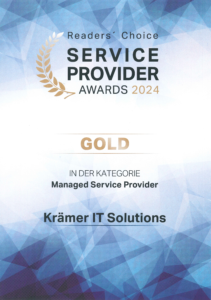 Dieses Zertifikat bescheinigt die Auszeichnung „Gold“ in der Kategorie “Managed Service Provider” bei den Service Provider Awards 2024. Ein großer Erfolg, wenn man bedenkt, dass Krämer IT im direkten Vergleich mit den größten IT-Anbietern Deutschlands angetreten ist.